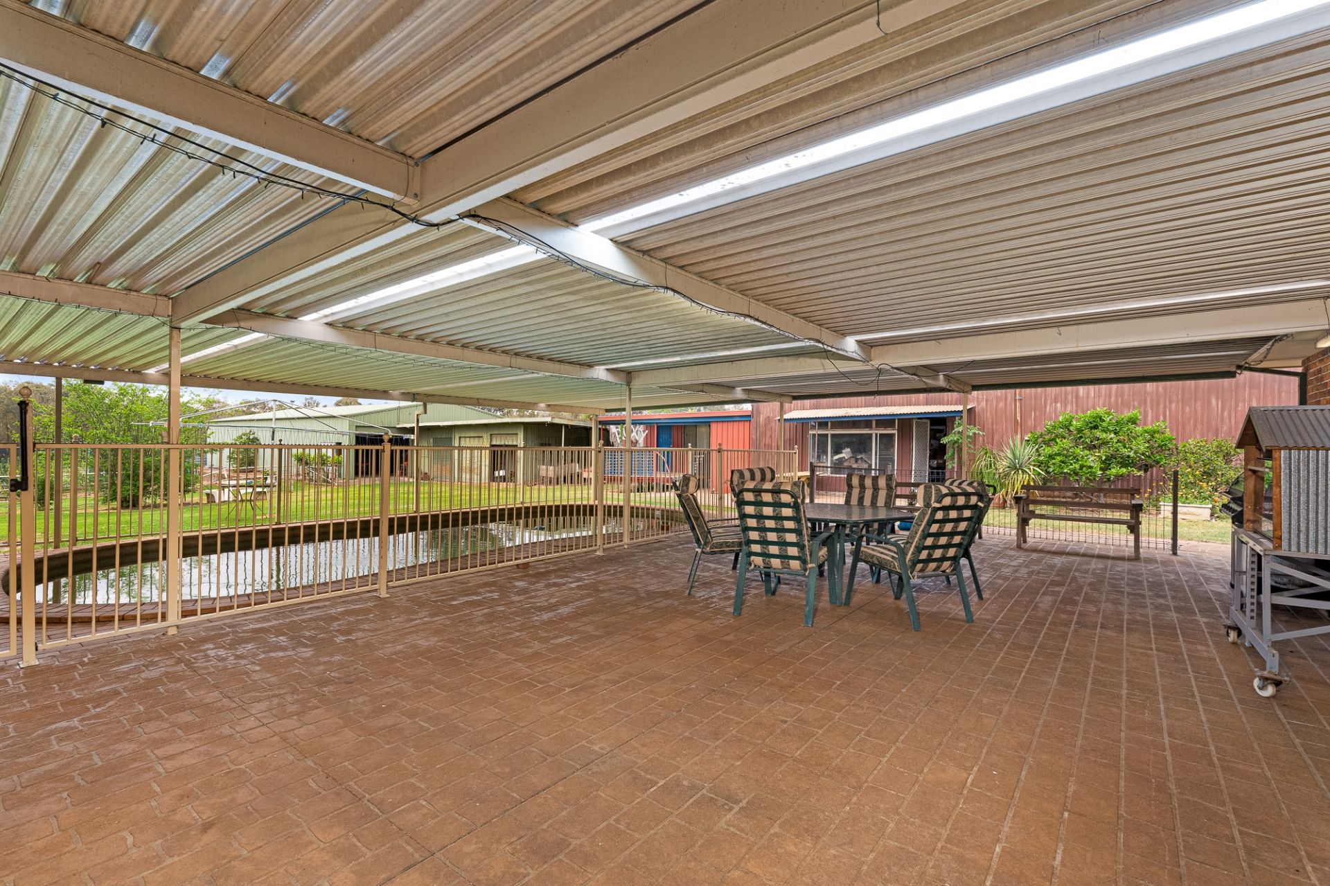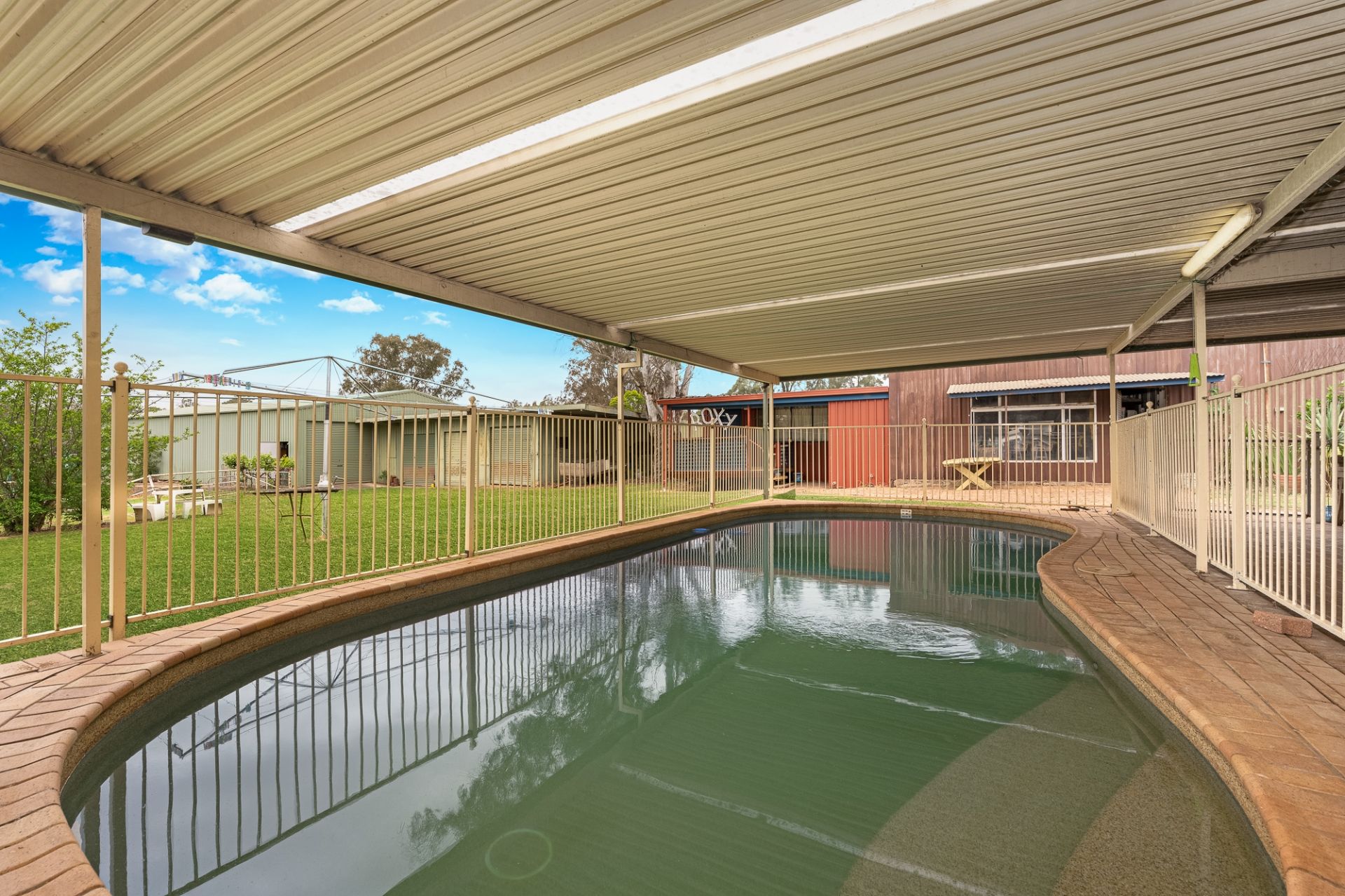 • In-ground saltwater swimming pool with covered pergola.