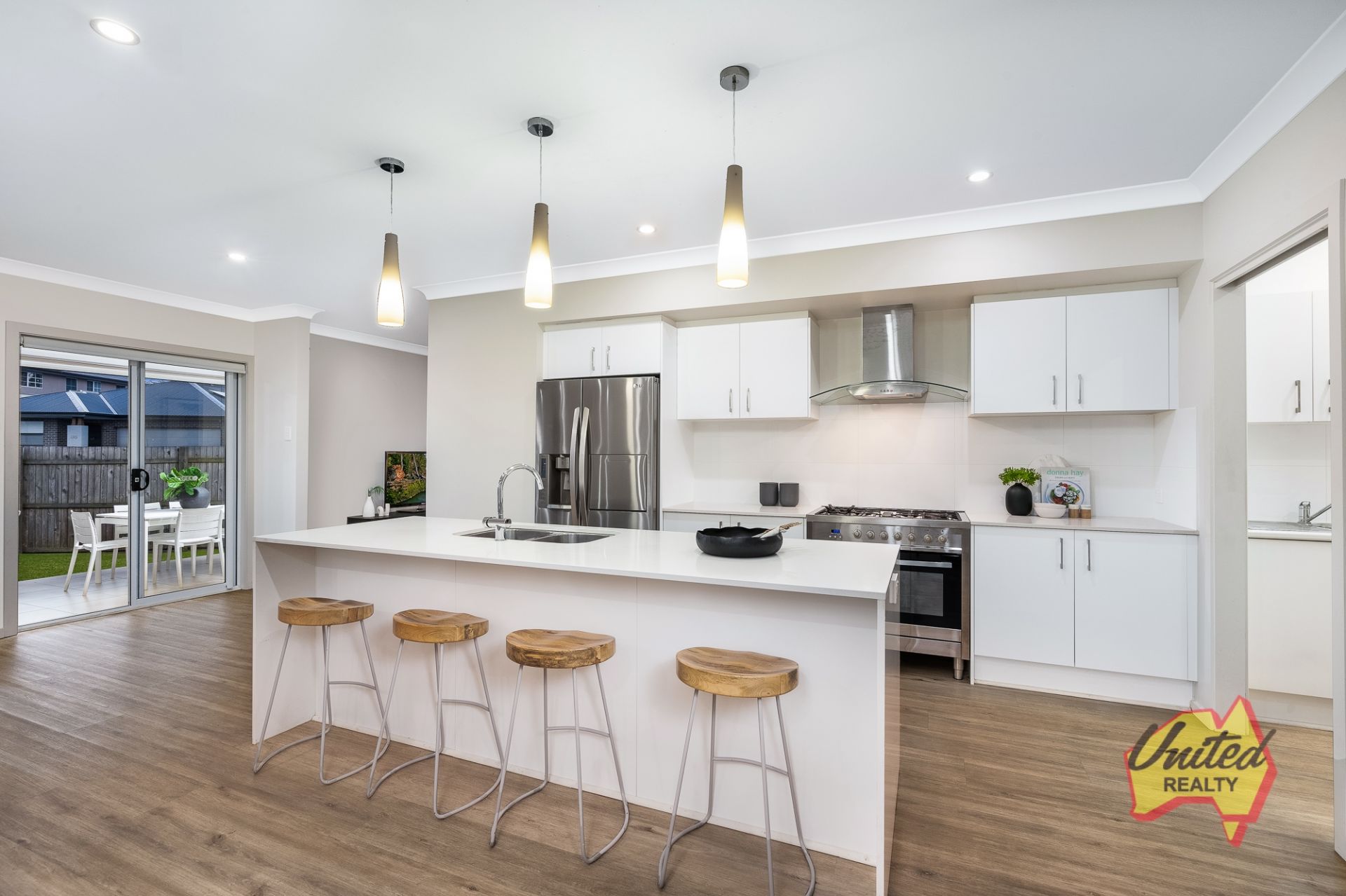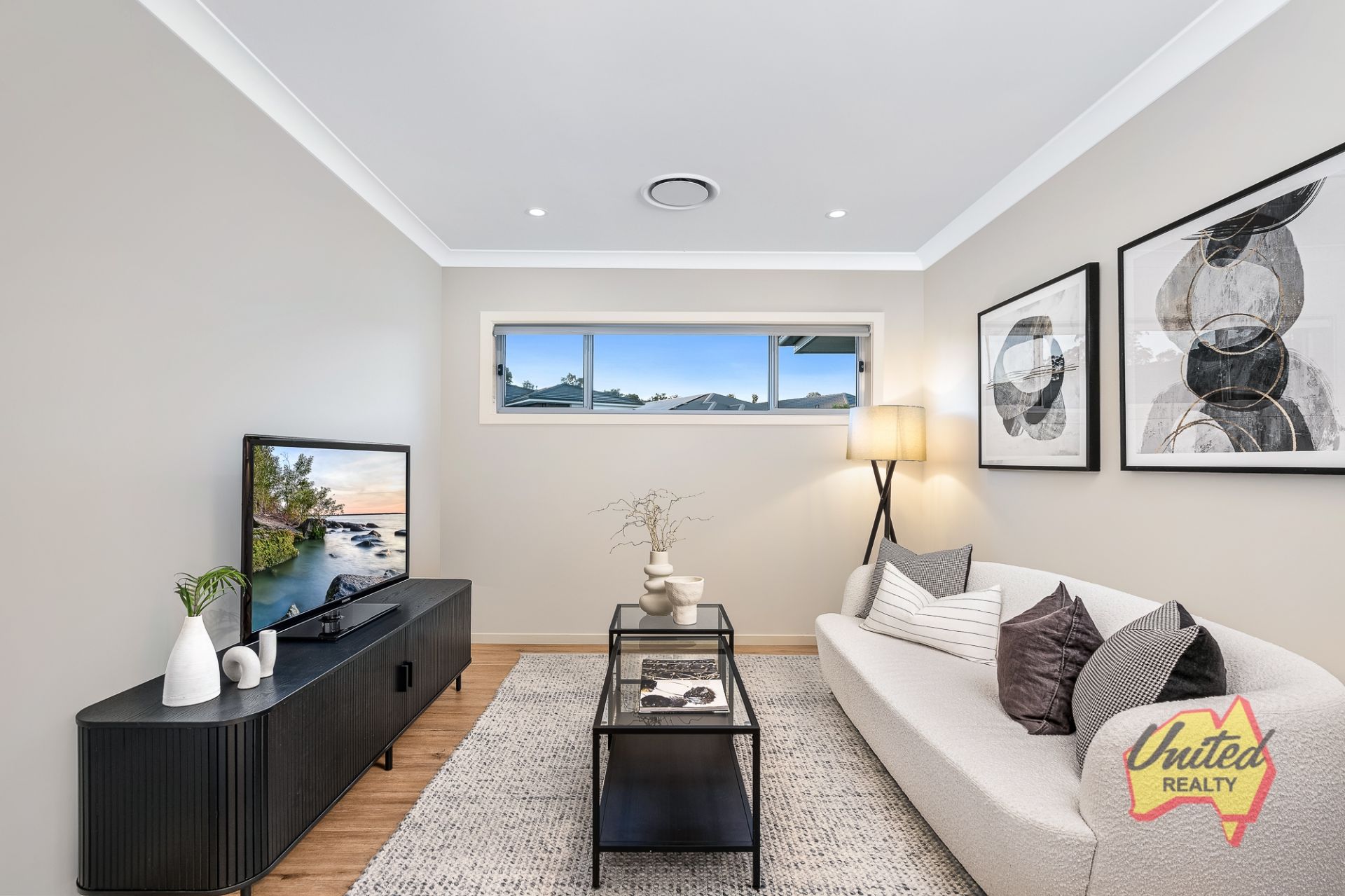 The kitchen is a chef's delight, boasting a neutral colour palette, top-quality Caesarstone benchtops, a dishwasher, ducted rangehood, 900mm gas cooktop, built-in microwave, and a large walk-in butler's pantry, complete with an additional sink and ample storage. The open-plan dining area and living room flow seamlessly from the kitchen, with a theatre room perfect for cozy movie nights.