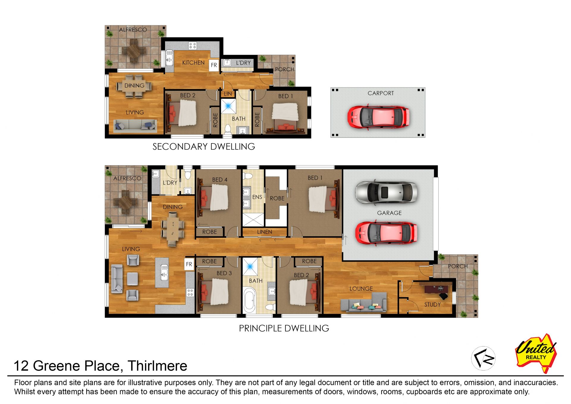 • Main home plans include an open plan kitchen, living, and dining, a separate loungeroom, an alfresco area, a study, an ensuite and walk-in robe to the master, built-in robes to the remaining three bedrooms, and more.
